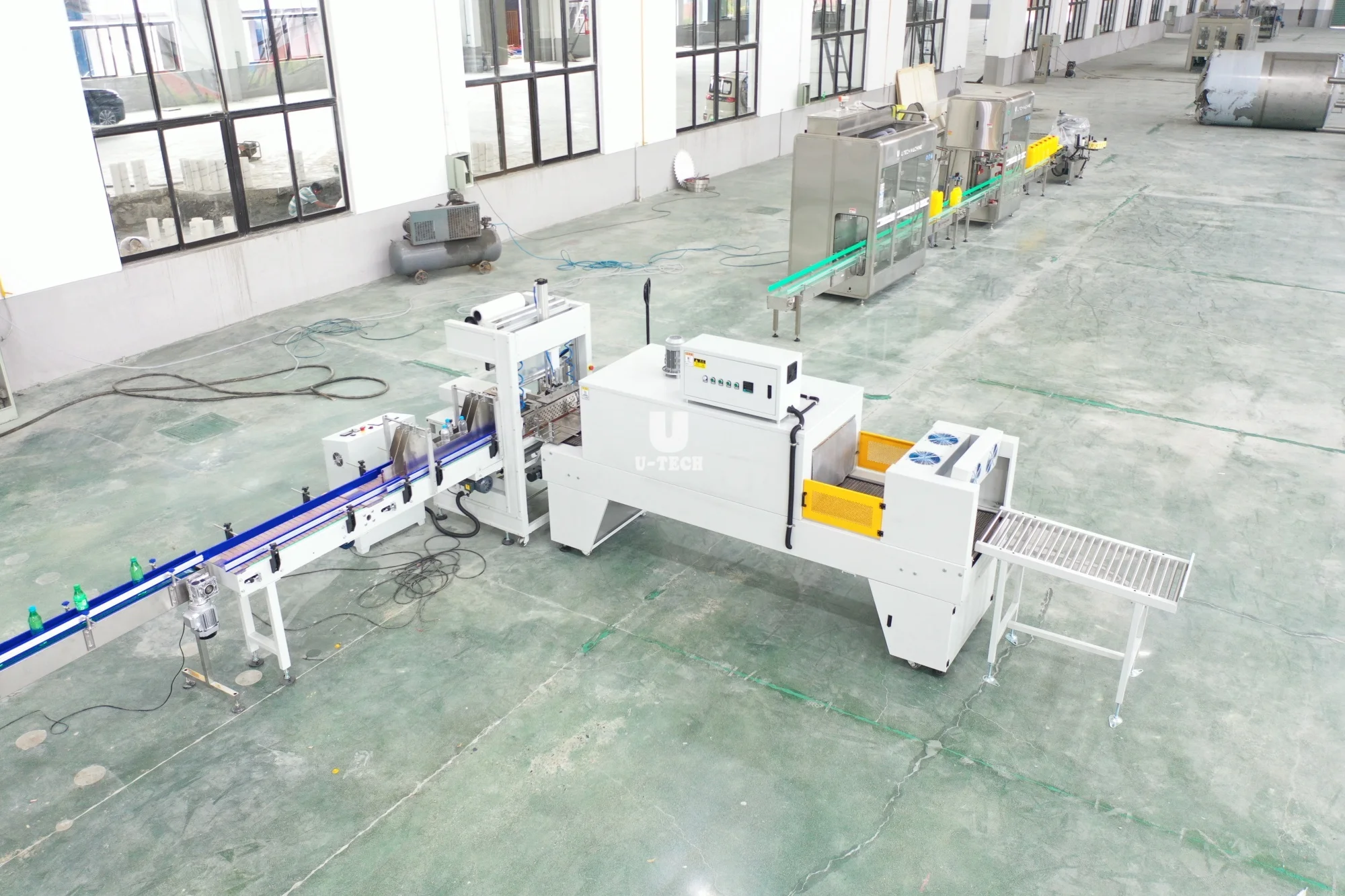 full automatic functions of bottle transfer and arrange ,membrane packing ,sealing and cut ,shrinkage ,cooling and shaping ,etc .